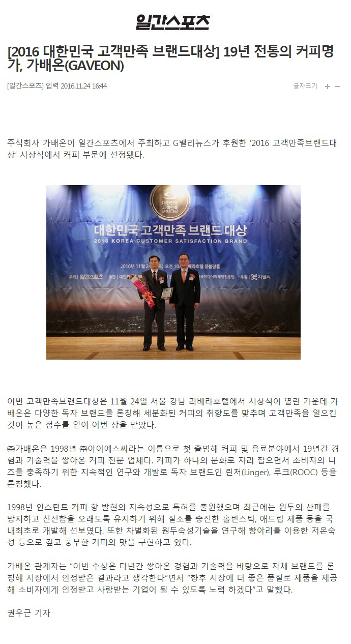 [일간스포츠] 2016 대한민국 고객만족 브랜드대상 '가배온'