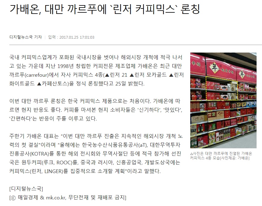 [매일경제] 가배온, 대만 까르푸에 '린저 커피믹스' 론칭